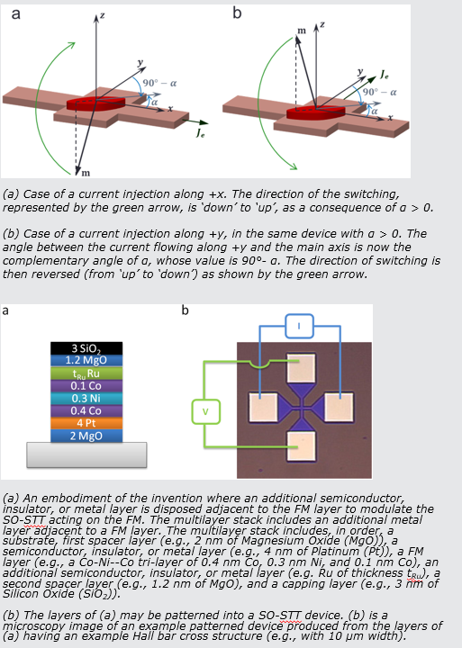 The SO-STT device that uses a non-symmetric (e.g. tilted ellipse) device geometry may be further improved by integrating an additional semiconductor, insulator or metal layer into the device's multilayer stack for giant modulation of SO-STT. By integrating the additional semiconductor, insulator or metal layer, a significant reduction of SO-STT switching current density may be achieved. Depending on the embodiment, the additional semiconductor, insulator or metal layer may be disposed adjacent to the FM layer, or within the FM layer, among other possibilities.